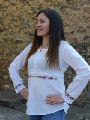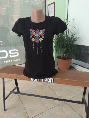 Дамска тениска от памук – еластан. Изключително удобни! Може да се облече както на празник, така и в ежедневието. Всяка българка заслужава да има такава в гардероба си!