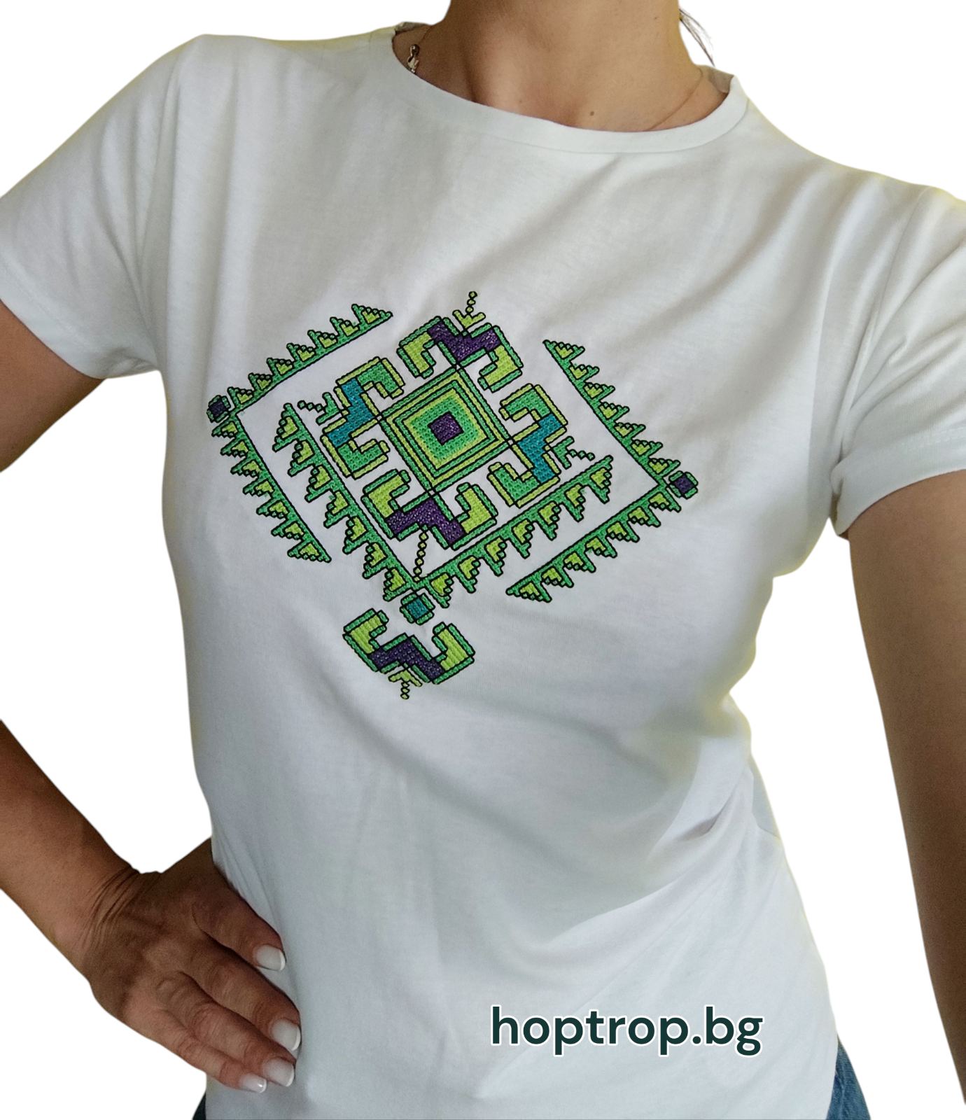 Тениска, бродирана с шевица Елбетица. Елбетицата е един от най-често срещаните елементи в българските народни шевици, която олицетворява мощ и сила.