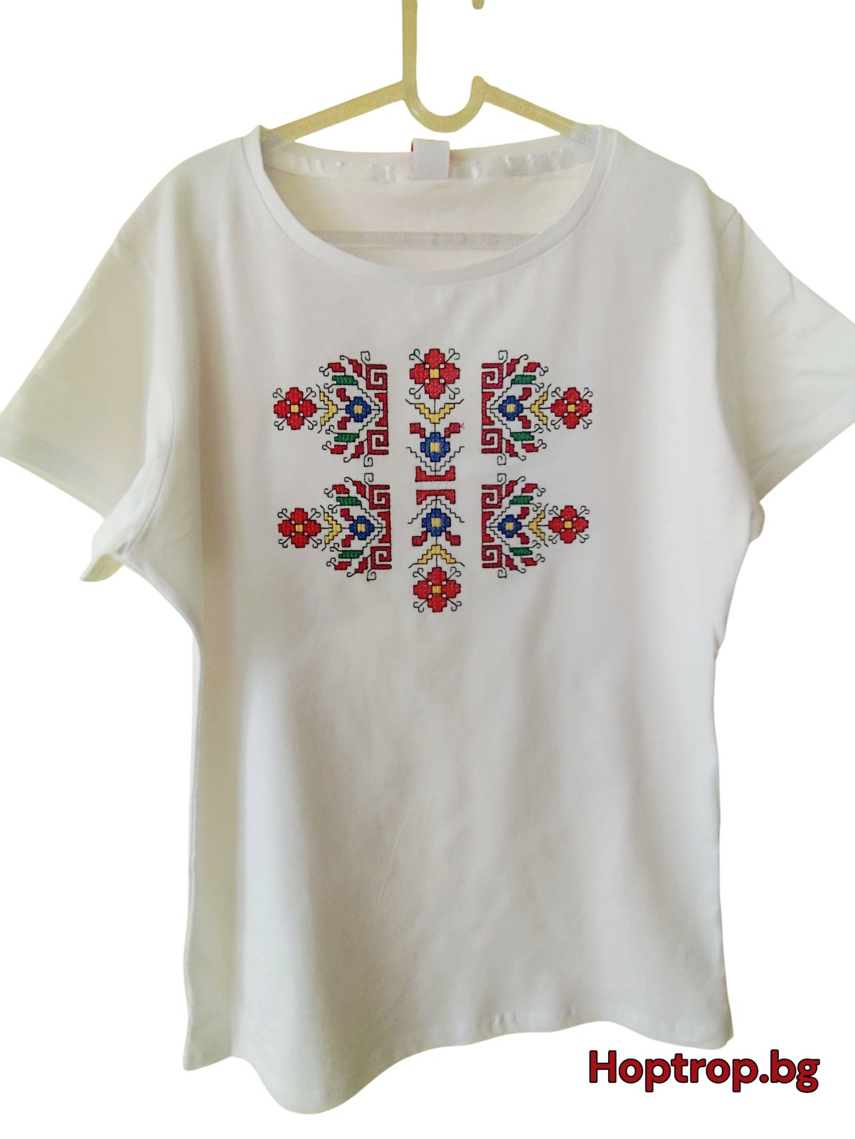 Тениска, бродирана с шевица Елбетица. Елбетицата е един от най-често срещаните елементи в българските народни шевици, която олицетворява мощ и сила.