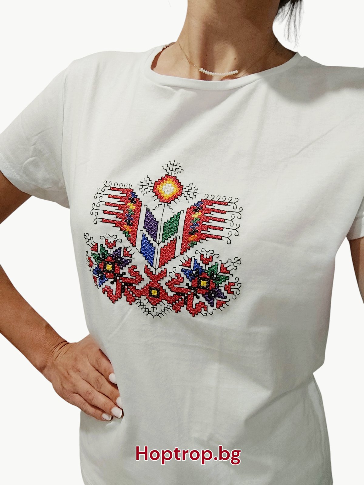 Тениска, бродирана с шевица Елбетица. Елбетицата е един от най-често срещаните елементи в българските народни шевици, която олицетворява мощ и сила.