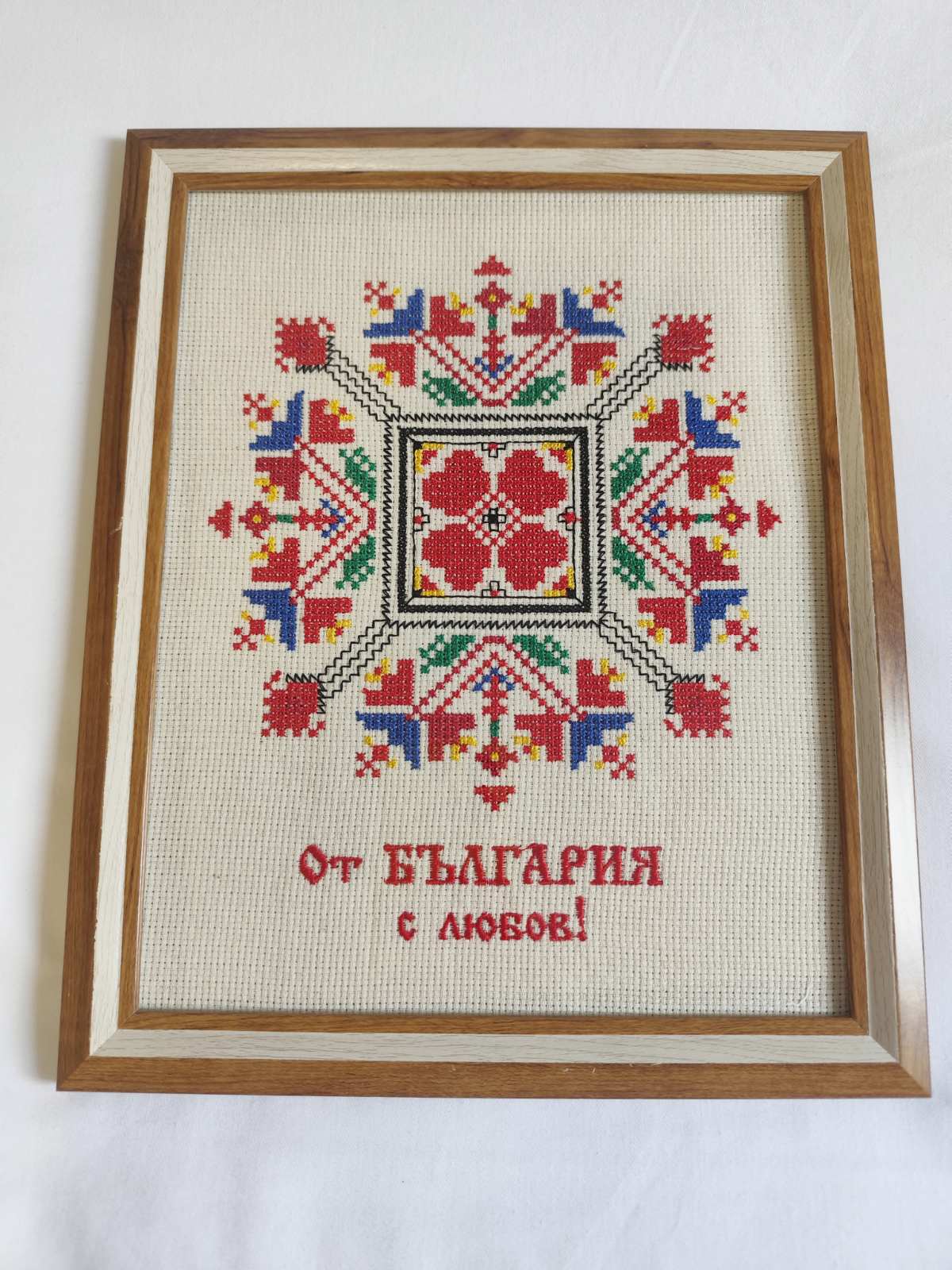 Бродерията е машинна, изработена върху памучна панама – цвят екрю. Рамката е пластмаса, а отпред стъкло!