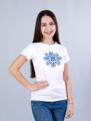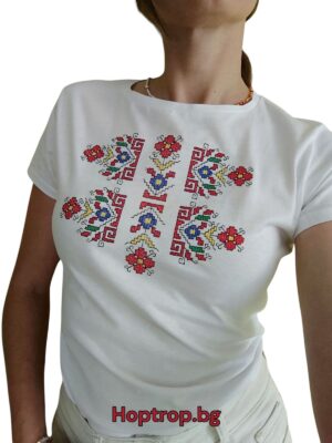 Бяла тениска с бродирана шевица “Цветница”