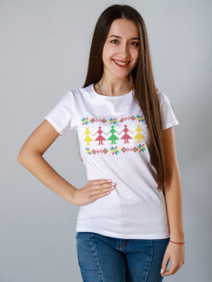 Бродирана, дамска тениска с танцуващи моми, хванати за ръце.