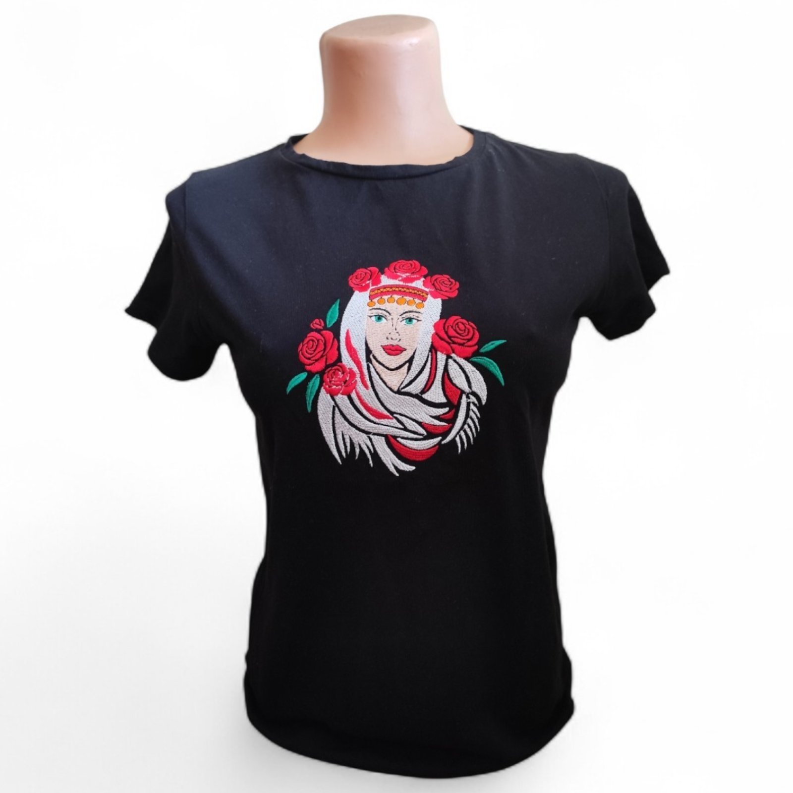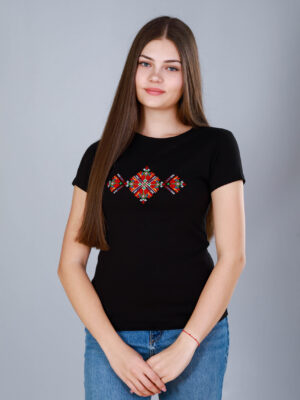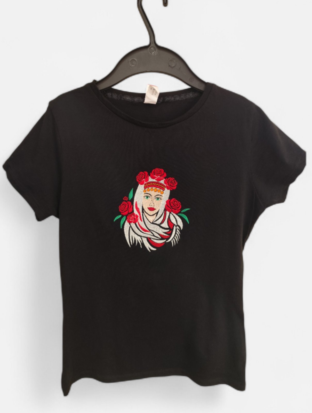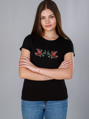 Стилна, черна тениска, бродирана с красива българска мома – символ на женственост, красота и български дух!