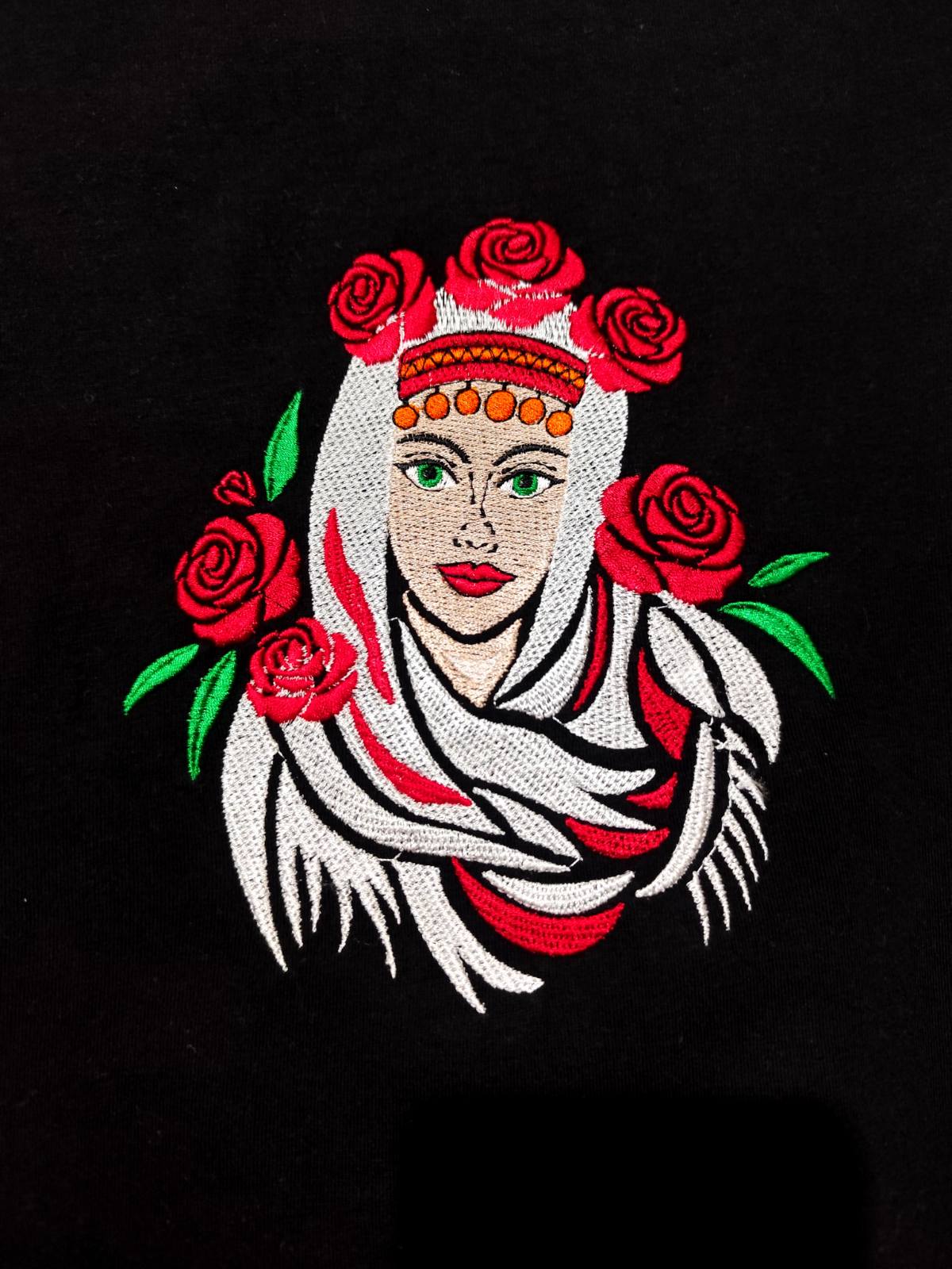 Изобразена с нежна забрадка и венец от рози, момата носи усещане за традиция, сила, елегантност!