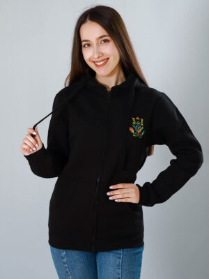 Дамска блуза с цип и качулка, бродирана с автентична българска шевица от Самоковския край.
