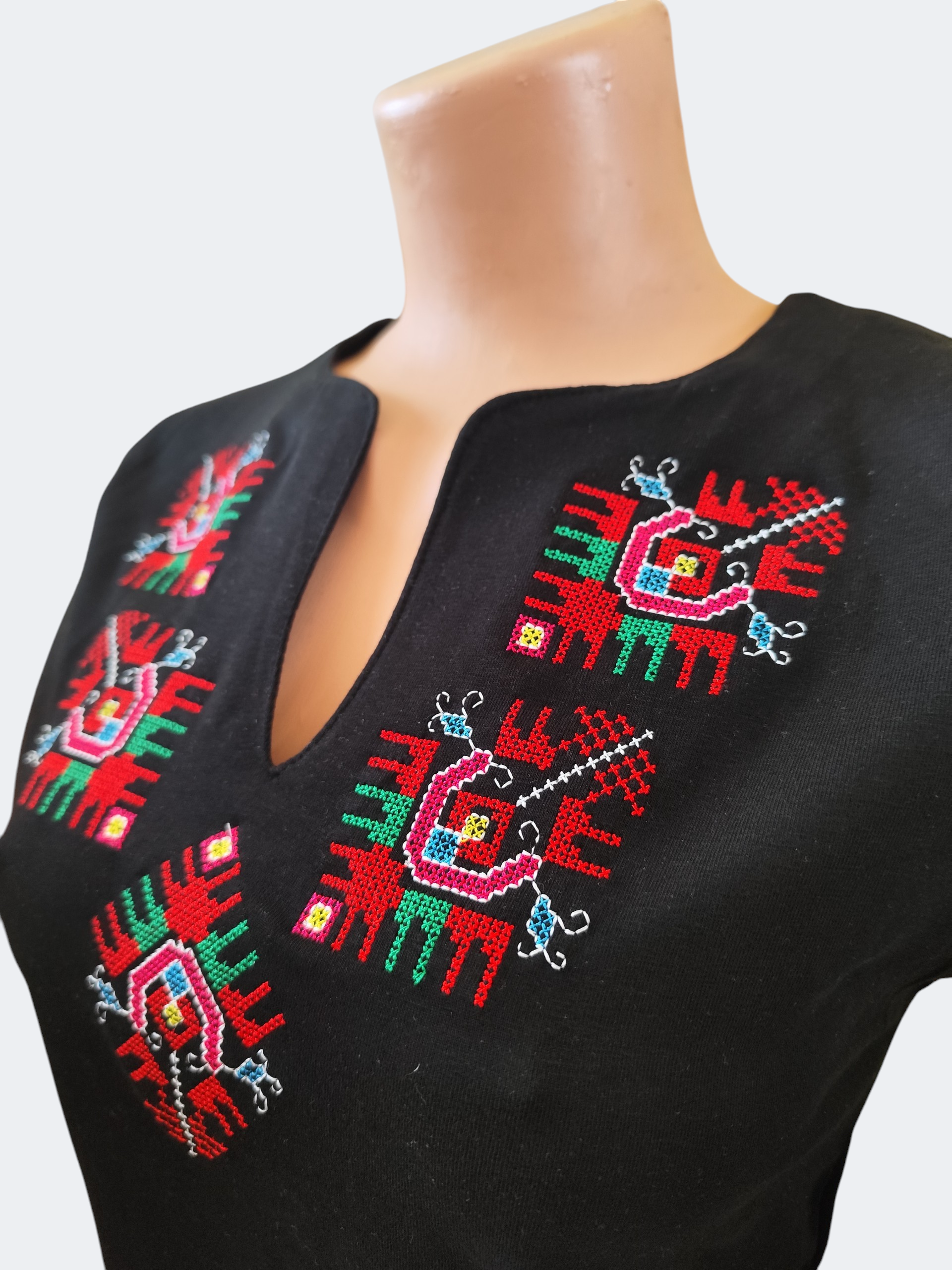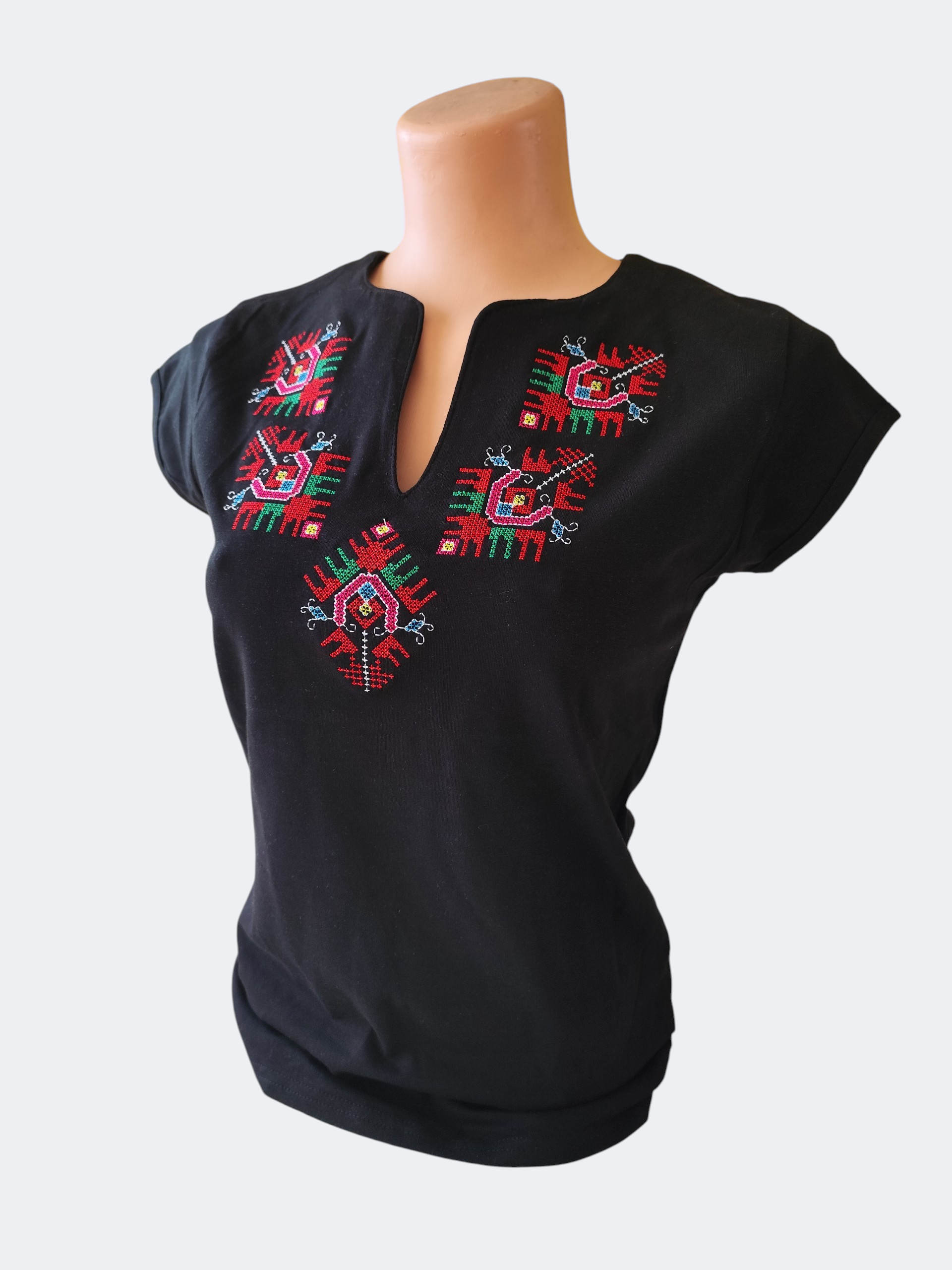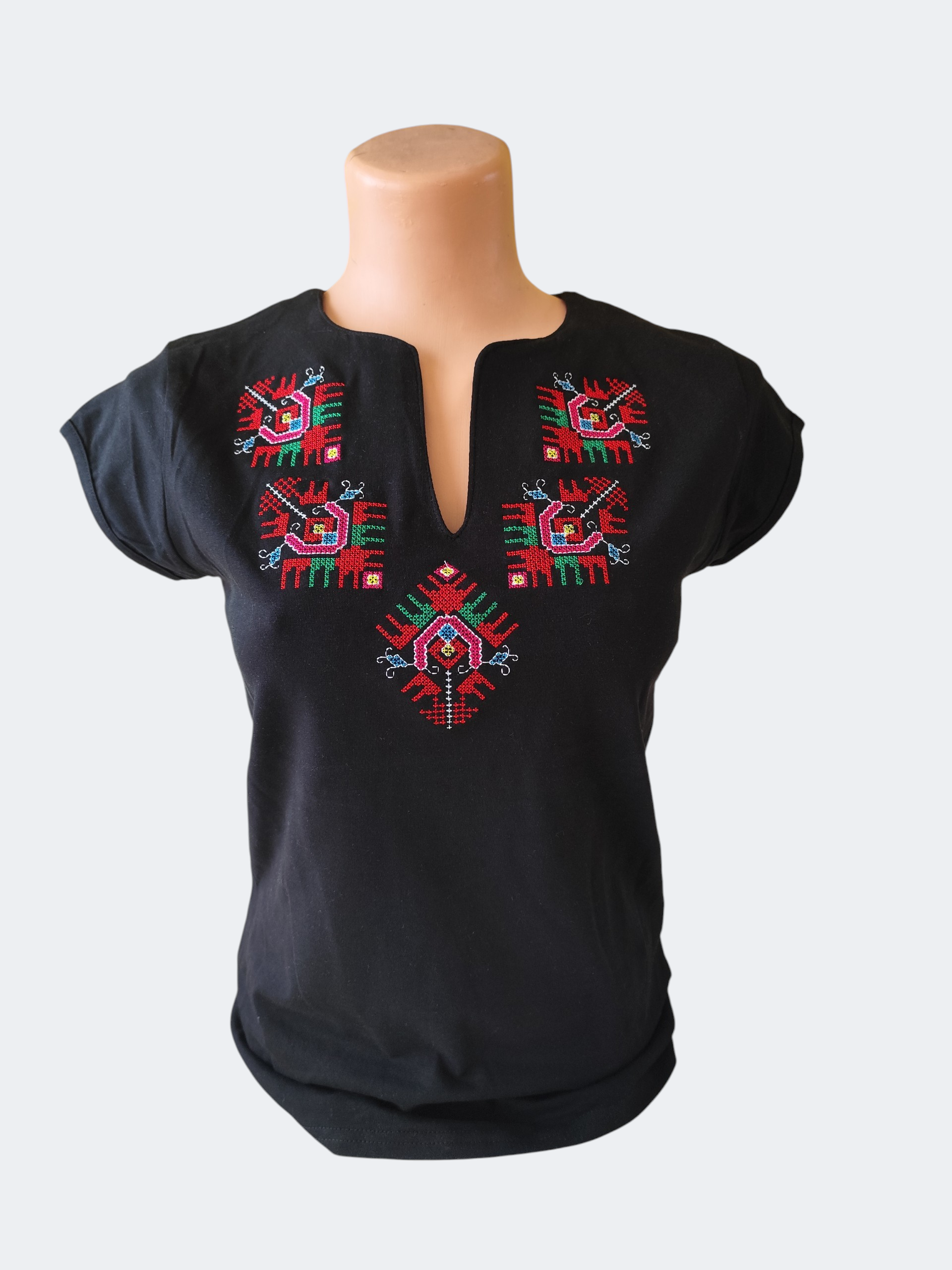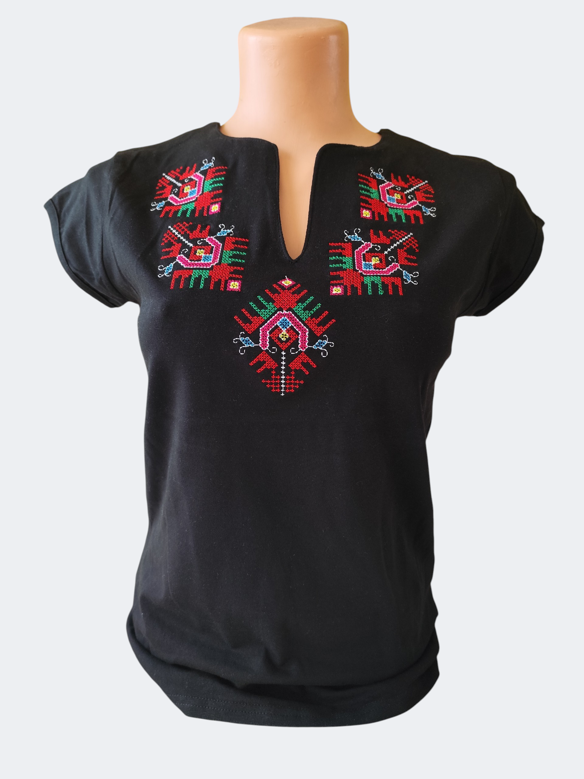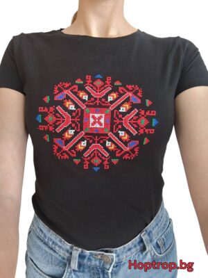 Тениска с богата бродерия в червено. По модел на автентична Самоковска шевица. Налична и в още няколко цвята ( розов, зелен, син, цветна)