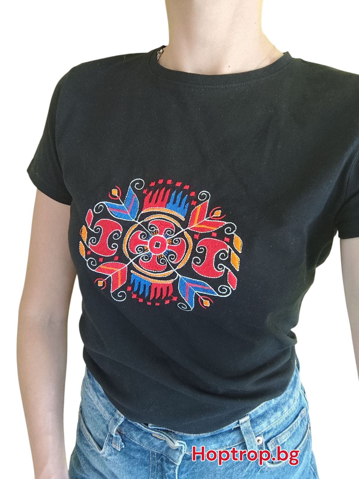 Бродирана, дамска тениска с танцуващи моми, хванати за ръце.