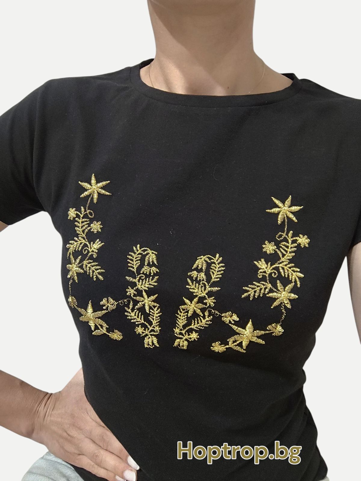 Дамска, черна тениска с шевица “Пролет” модел 1