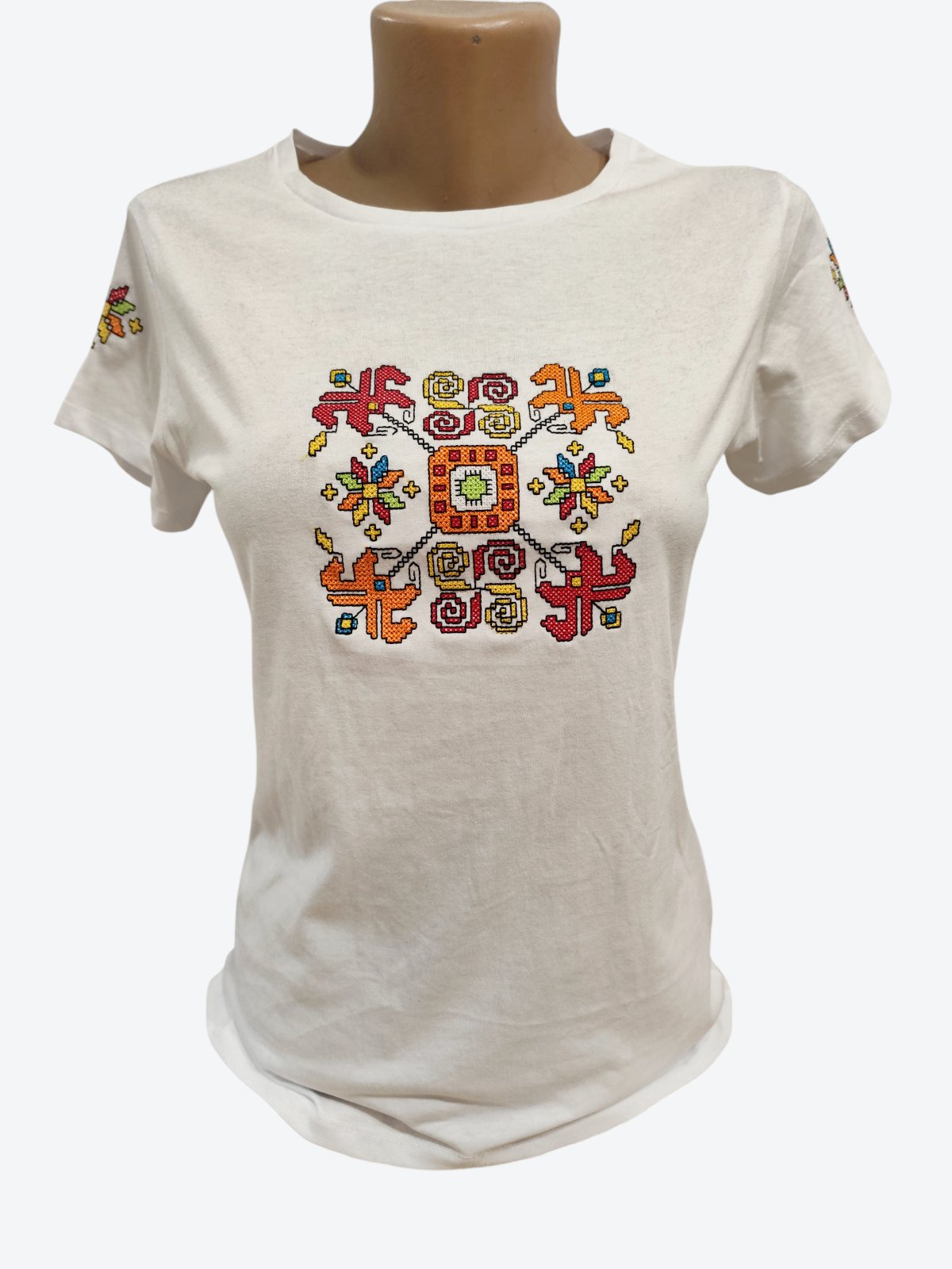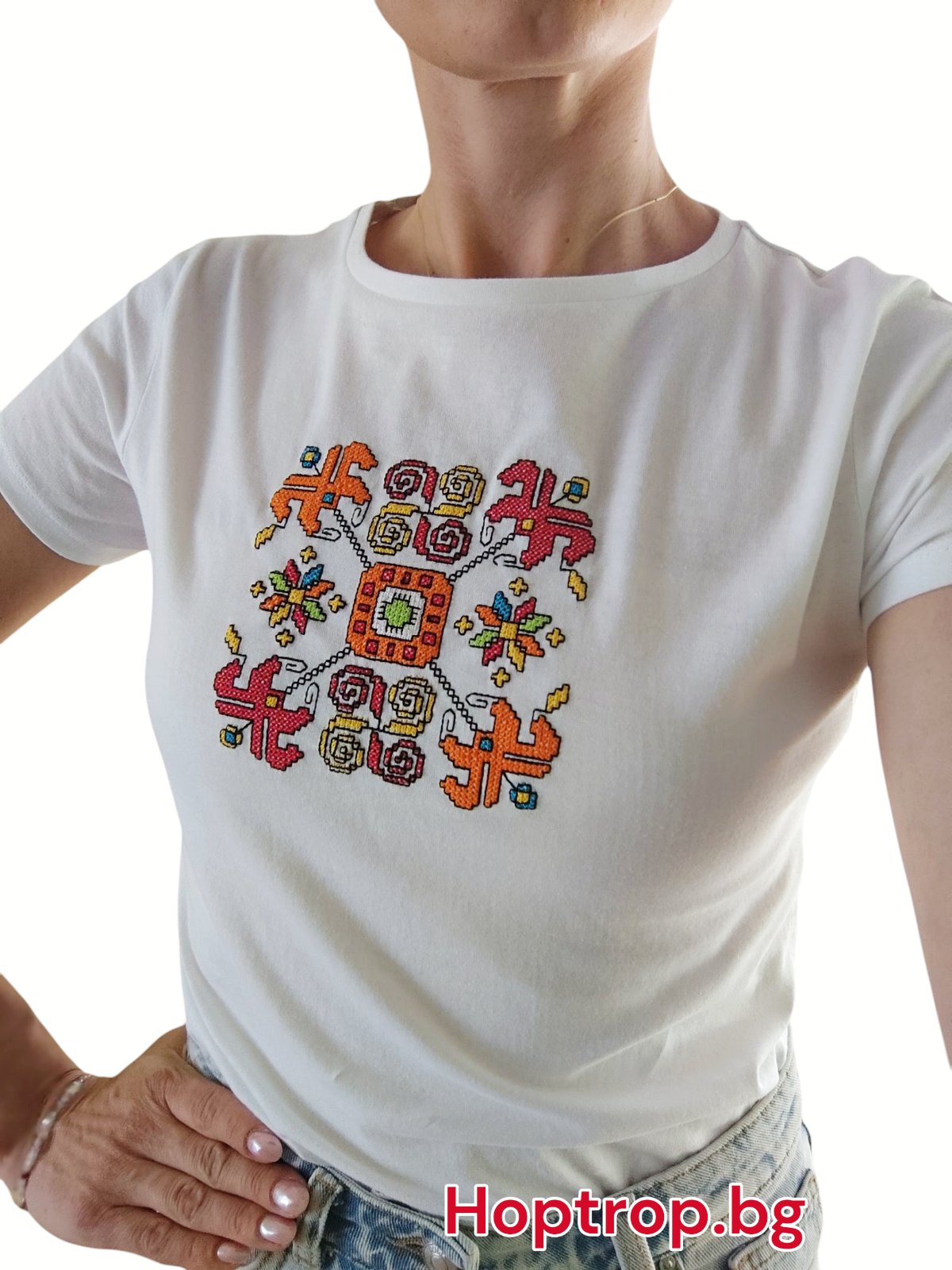 Тениска с къс ръкав с видинска бродерия. По модел на автентична българска шевица.