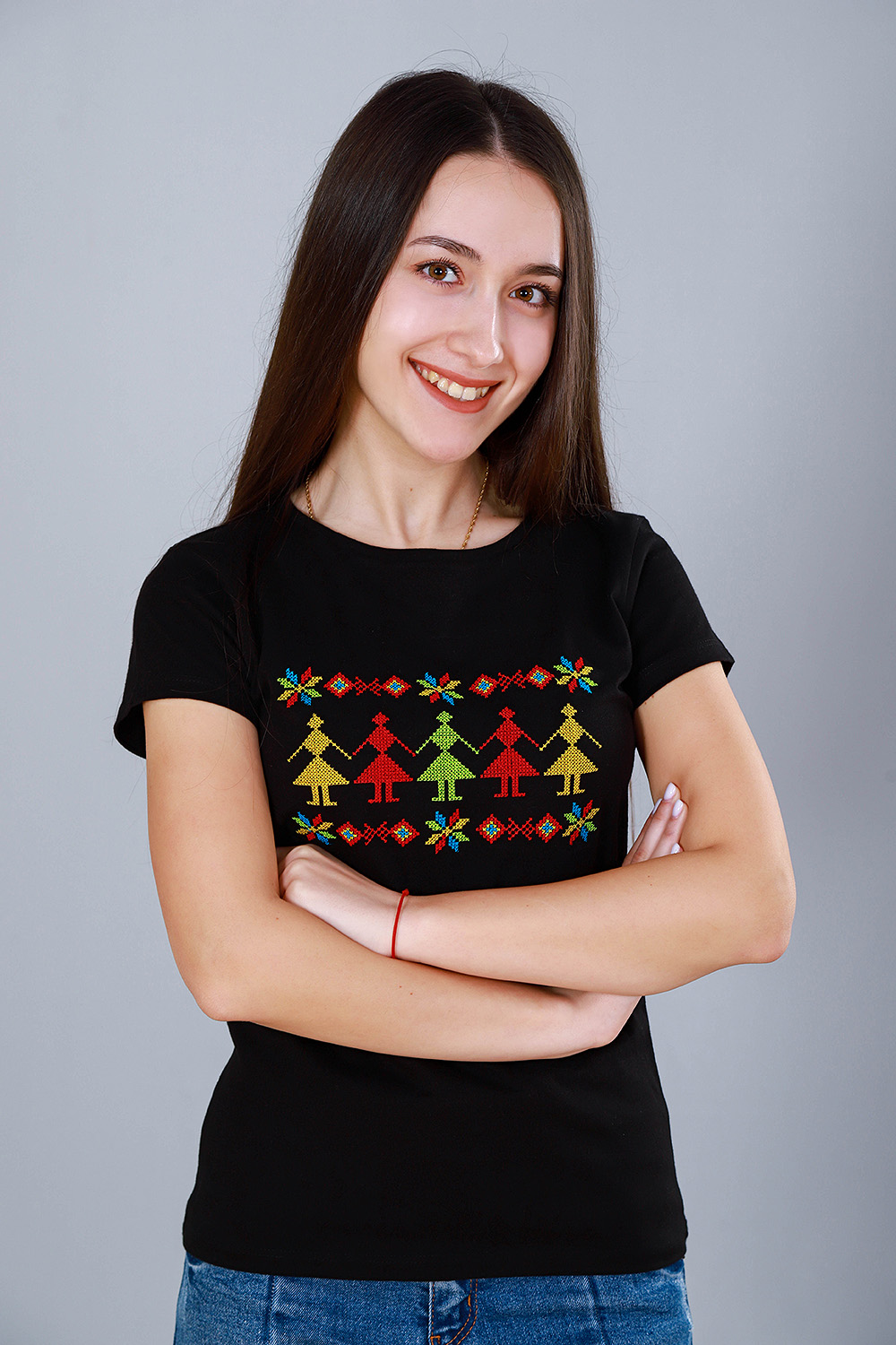 Дамска тениска с шевица, бродирана с АЗ-ът на българите. Предлага се и в черен цвят.