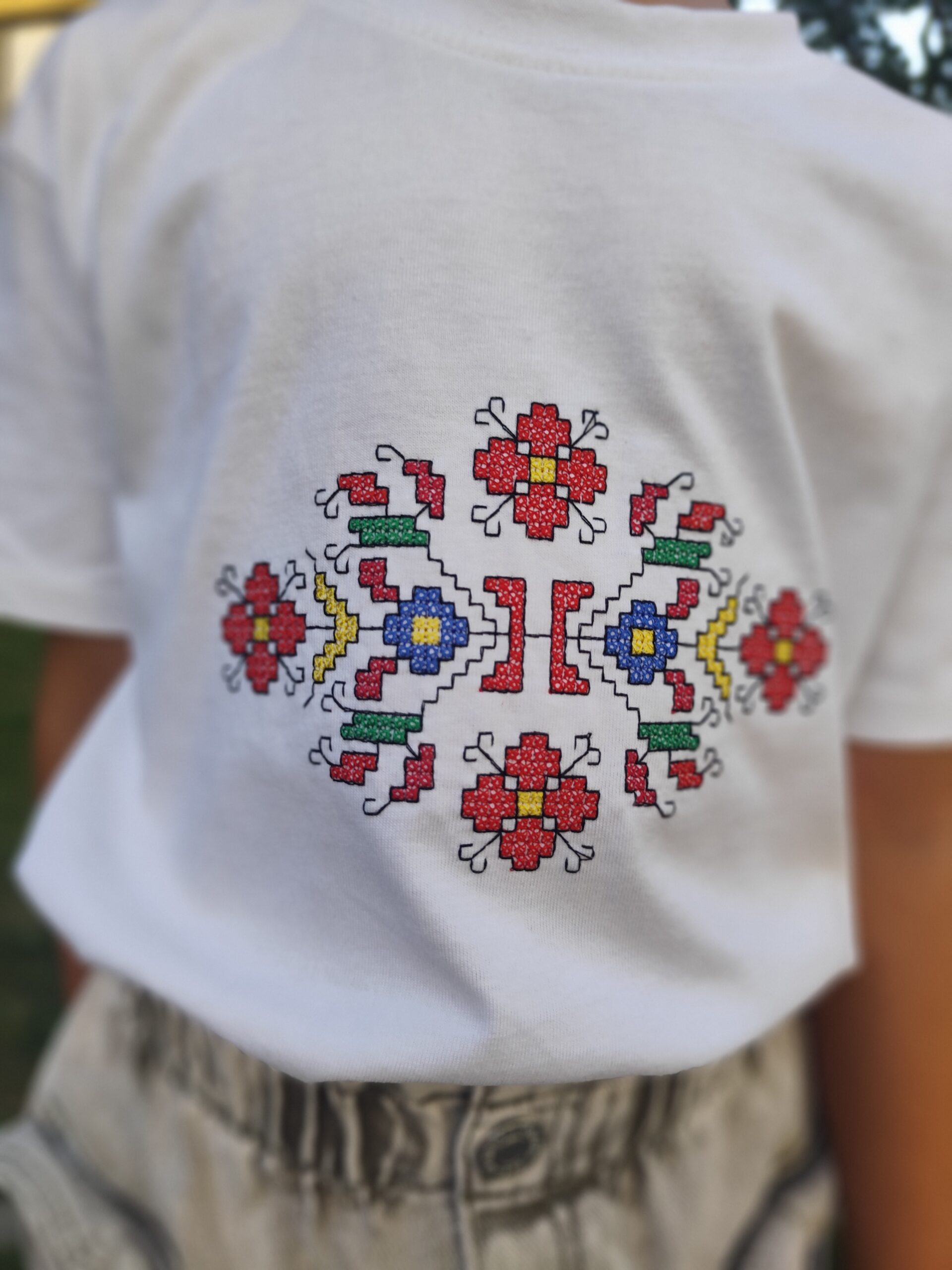 Детска тениска, бродирана със шевица от Самоков. Богата бродерия с наситени цветове.