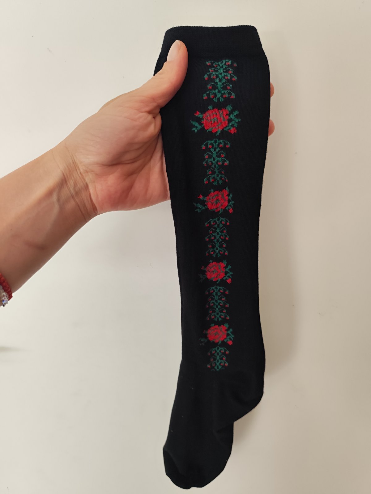Фолклорни чорапи до коляното! Изчистен модел с цветя от двете страни на крака по дължината. Ластична плетка.