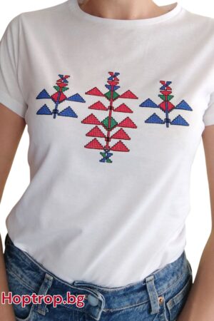 Тениска, бродирана с шевица Елбетица. Елбетицата е един от най-често срещаните елементи в българските народни шевици, която олицетворява мощ и сила.